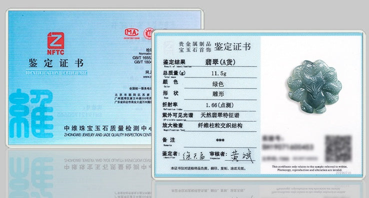 This Natural A Jadeite Pendant features a finely carved nine-tailed fox, crafted from translucent blue jadeite of the glutinous variety. With its smooth texture and delicate polish, the pendant radiates elegance and mystery, making it both a meaningful charm and a sophisticated accessory.