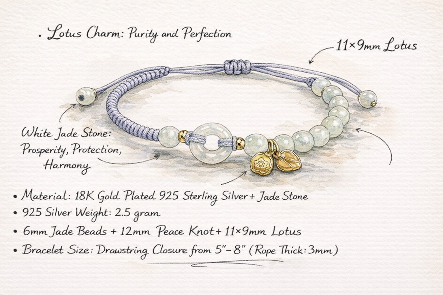 This bracelet features a serene lotus charm paired with smooth white jade beads, strung on a soft adjustable drawstring.