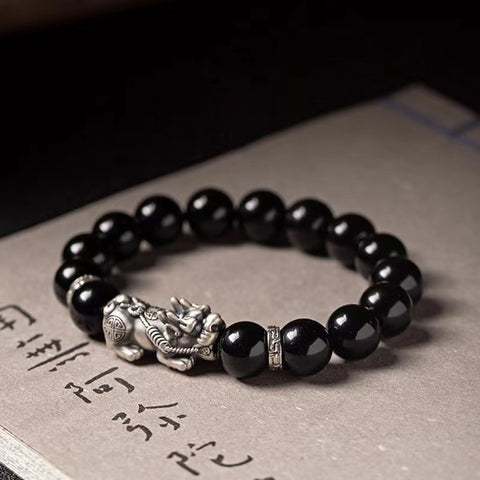 Natural Obsidian Silver Pixiu Lucky Bracelet