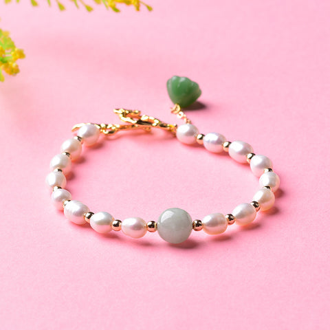 Natural Pearl White Jade Bracelet-Green Jade Lotus Flower