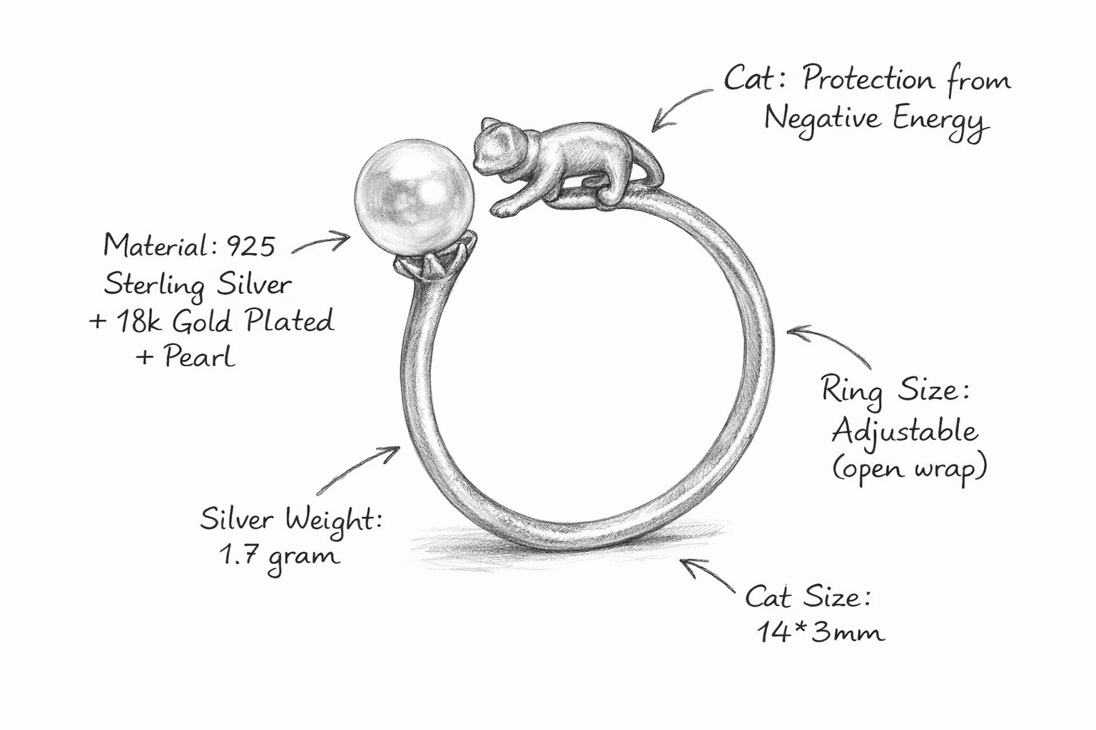 This Natural Pearl Cat Ring is a whimsical fusion of elegance and joy. Crafted with a delicate 18K gold-plated band, it features a mischievous kitten playfully reaching for a lustrous Natural Pearl. It is a "symbol of gentle courage," a shimmering anchor of S925 Sterling Silver that rests gracefully on your finger. Designed with an adjustable band for a perfect fit, it acts as your personal "Luck Cat," attracting positive energy and inner peace with every playful movement.