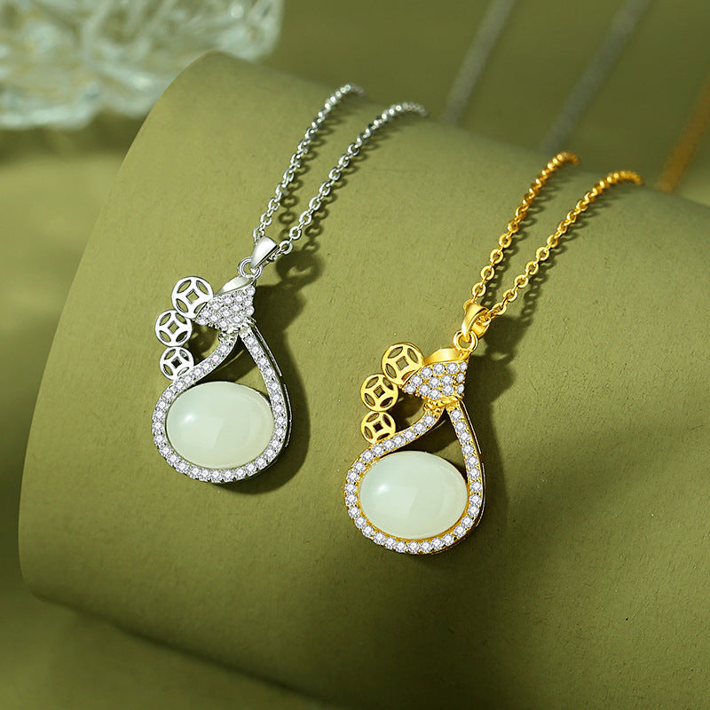 The pendant features a luminous natural Hetian jade, known for its smooth, translucent glow and soothing energy.
